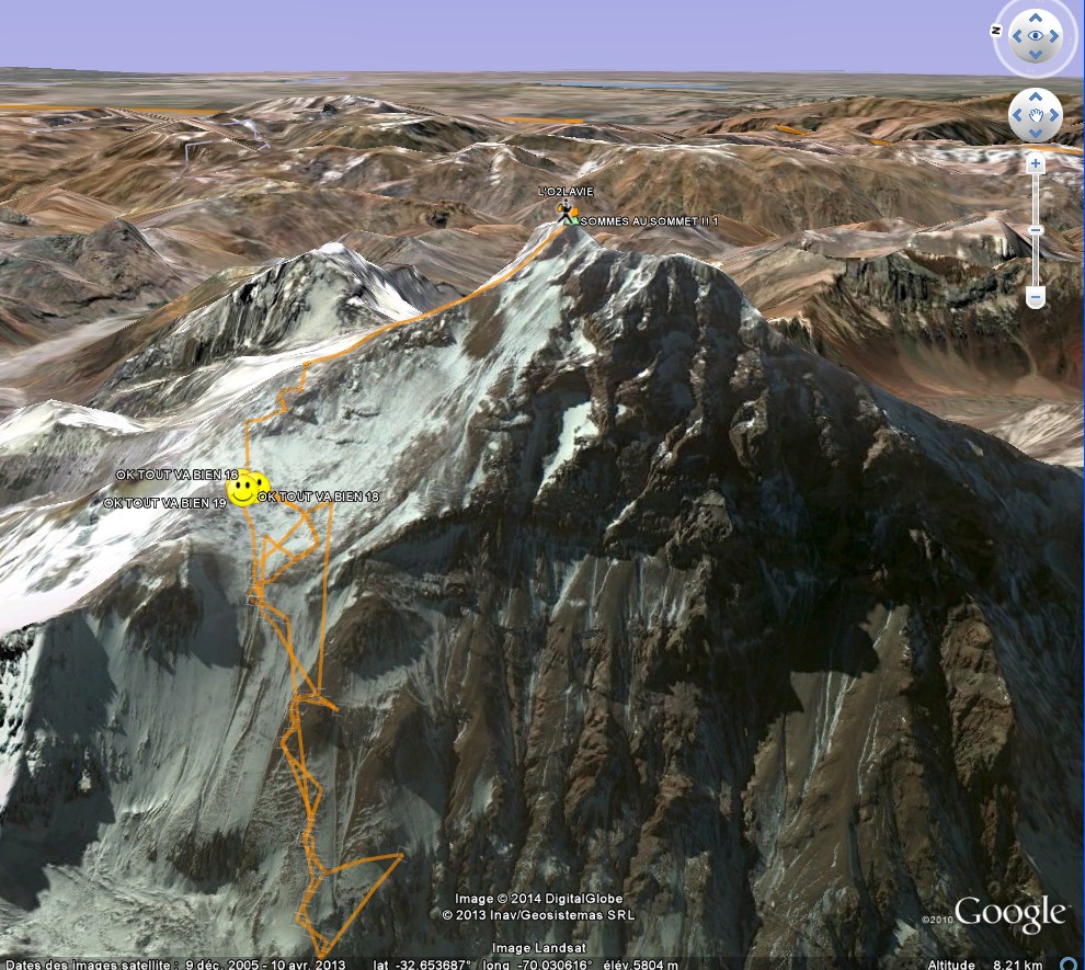 Le programme était un départ du camp 3 (6 050 m) à 5h00 du matin (heure locale) - 9h00 (en France) . La balise SPOT3 n'apparait pas allumée sur notre site pendant l'assaut du Géant des Amériques par notre équipe. Nous saurons dans quelques heures pourquoi par Christophe AUGIER. L'effet de surprise est énorme! A 18H01 (en France) réception du sms par la balise SPOT3, "NOUS SOMMES AU SOMMET". L'arrivée sur le sat-view était en temps réel.